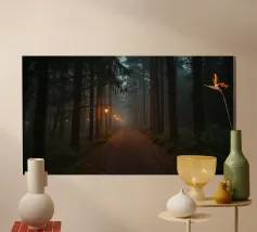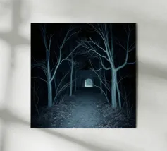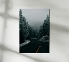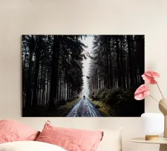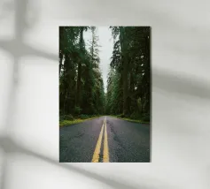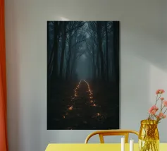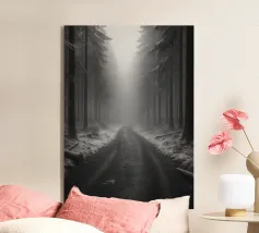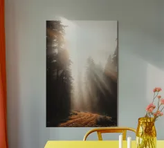 Chemin forestier brumeux avec une lumière douce filtrant à travers les grands arbres plexiglas