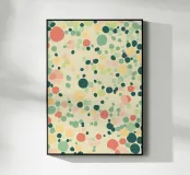 Cette œuvre d'art numérique abstraite et amusante présente un motif dense et aléatoire de cercles et de points qui se chevauchent. La palette inspirée de la modernité du milieu du siècle dernier utilise des couleurs ludiques telles que le rose corail, le jaune pâle, le vert citron et la sarcelle profonde sur un fond crème. La variété de taille et de couleur des points crée une texture joyeuse, semblable à des confettis, et un rythme visuel dynamique. Ce motif vivant est idéal pour ajouter une touche de charme rétro et d'énergie ludique à un salon, un bureau ou un espace pour enfants. Ce poster numérique de haute qualité (7000x5000 pixels, 300 dpi) garantit une reproduction parfaite des couleurs vives.