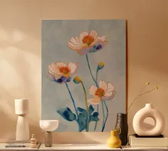 Illustration artistique de coquelicots aux pétales éclatants de rouge et d’orange, se détachant sur un fond bleu clair. Une affiche murale élégante et vibrante, parfaite pour ajouter une touche florale et chaleureuse à votre intérieur.