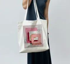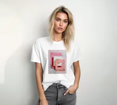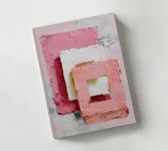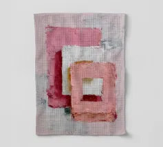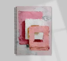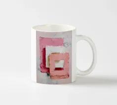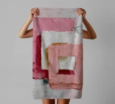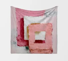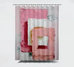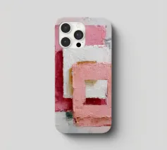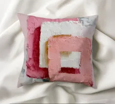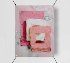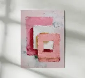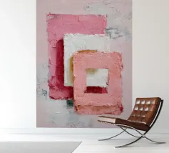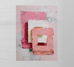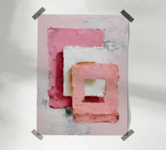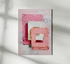 This abstract artwork features overlapping pastel-coloured rectangular shapes with a visible palette knife texture and rough surface. Soft shades of pink, white and red create depth and a modern, minimalist visual effect. The composition conveys calm, balance and a contemporary, hand-painted aesthetic.