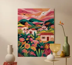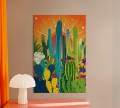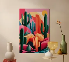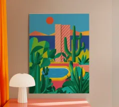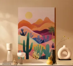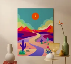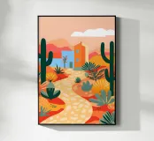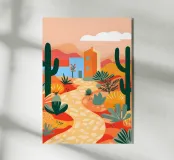 Un paysage désertique présente un chemin sinueux menant à une petite maison, entourée de cactus et de diverses plantes désertiques. Des tons chauds d'orange et de rose remplissent le ciel et l'arrière-plan, donnant l'impression d'un coucher de soleil serein.