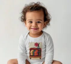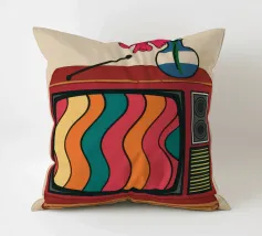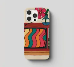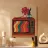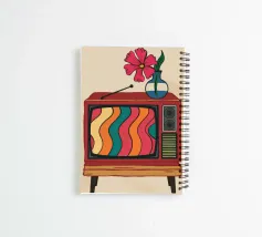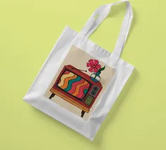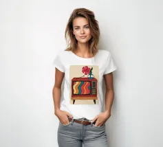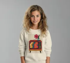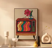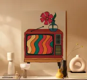 Illustration surréaliste et nostalgique d'une simple fleur rouge s'épanouissant sur l'écran d'un téléviseur vintage à panneaux de bois.