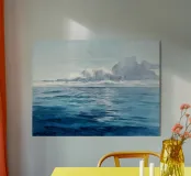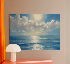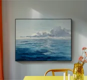 Avec ses nuages doux flottant au-dessus d'un vaste océan intact, cette peinture évoque la tranquillité de l'eau libre. Les subtiles variations de bleu révèlent la profondeur et la distance, invitant le spectateur à respirer avec la marée.