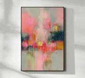 Cette œuvre d'art abstraite représente des aplats de couleurs pastel rose, jaune, bleu, vert et rose qui se fondent les uns dans les autres. Les textures douces du pinceau et la composition harmonieuse des couleurs pop art créent une atmosphère vibrante et vivante. Le motif est moderne, léger et émotionnel, et invite à une libre interprétation.