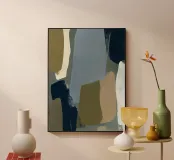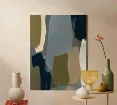 A modern abstract painting built from softly layered, organic blocks of color. Muted slate blue, deep navy, olive green, warm sand, and off-white overlap in a calm, vertical rhythm. The brushwork is relaxed and matte, with subtle texture that gives the surface depth without visual noise. Neutral yet expressive, this piece feels grounded and contemporary, making it an easy fit for modern, minimalist, Scandinavian, or natural interiors. Ideal for living rooms, bedrooms, or workspaces where a sense of balance, restraint, and quiet sophistication is desired.