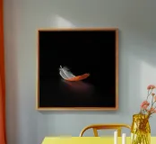 Une plume flotte dans la pièce sombre – un moment paisible entre légèreté et équilibre, rehaussé d'une touche de couleur chaude.