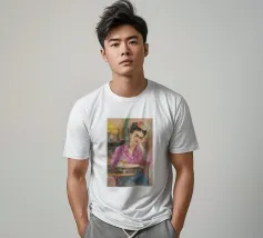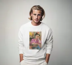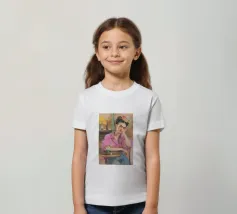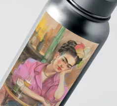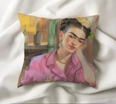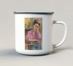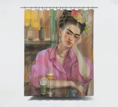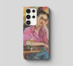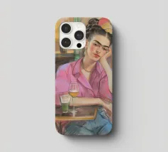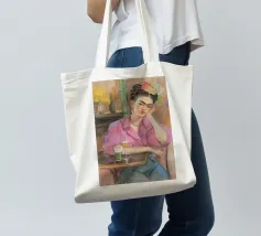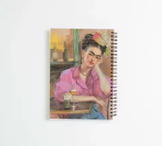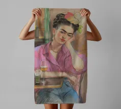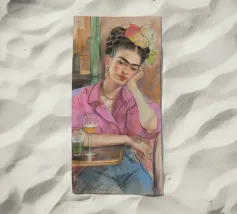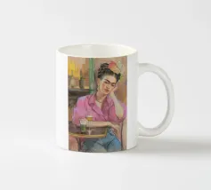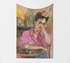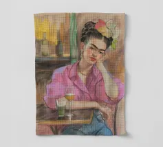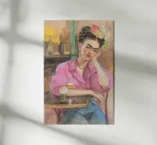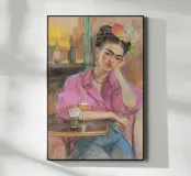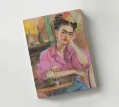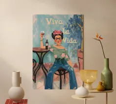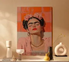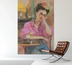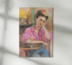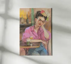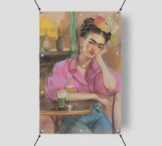 Le motif représente une illustration inspirée de Frida, montrant une femme sûre d'elle dans une scène de café détendue, avec une coiffure relevée caractéristique, des accents floraux et un regard expressif. La palette de couleurs chaudes, les lignes esquissées et la peinture moderne allient force artistique et intimité sereine. Dans l'ensemble, l'image est créative, féminine et intemporelle, idéale comme décoration murale élégante et expressive.