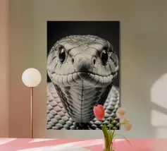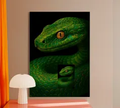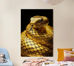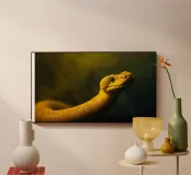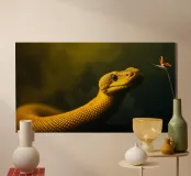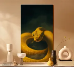 Le python jaune vif présente des écailles complexes et une expression curieuse, mettant en valeur son élégance dans un environnement faiblement éclairé qui rehausse ses couleurs vives.