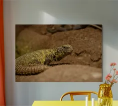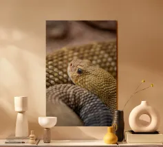 Gros plan sur un python jaune vif enroulé sur lui-même. plexiglas