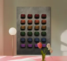 L'image montre trois macarons empilés les uns sur les autres dans des tons chauds - orange, rose et rouge - avec un fourrage crémeux. Le style est minimaliste et esthétiquement attrayant, avec un accent sur les contrastes de couleurs et la texture. La composition est moderne et appétissante, presque comme si elle sortait d'un magazine alimentaire haut de gamme ou d'une campagne publicitaire pour les pâtisseries françaises.