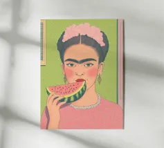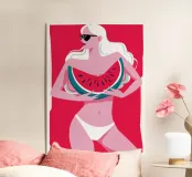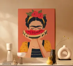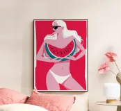 Illustration élégante d'une femme en bikini rouge et lunettes de soleil, tenant avec assurance une grosse tranche de pastèque. Cette œuvre d'art est l'incarnation du chic estival, capturant un moment de fraîcheur et de rafraîchissement fruité.