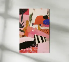 Collage abstrait vibrant et éclectique présentant un mélange de motifs audacieux, notamment des rayures, un imprimé guépard et des pois. La composition est une expression ludique et énergique d'un style bohème ou maximaliste moderne.