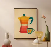A vibrant celebration of coffee culture, this artwork captures the essence of that perfect morning ritual. Featuring a retro-inspired moka pot in bold hues of orange and pink, paired with a playful mug, it’s a visual love letter to coffee lovers everywhere. The warm tones and whimsical design invite you to savor every sip. Perfect for adding a splash of color and personality to any space, this piece is a must-have for those who can’t start their day without that essential cup of jo