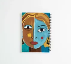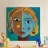Cette peinture représente un personnage aux cheveux dorés et à la peau bleue. La nature abstraite de l'œuvre crée un sentiment de réflexion et d'introspection.