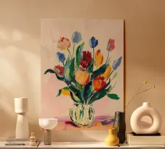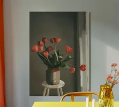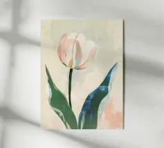 Illustration douce et élégante d’une tulipe rouge et orange délicatement placée dans un verre d’eau. Les nuances pastel du fond ajoutent une touche poétique et raffinée. Une affiche murale idéale pour une décoration florale apaisante et minimaliste.