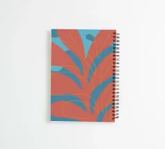 Dessin abstrait présentant de grandes formes curvilignes rouges superposées sur un fond bleu, entrecoupées de fines lignes jaunes fluides. La composition crée une impression de mouvement et de motifs organiques.