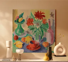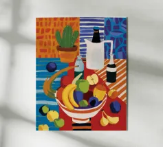 A modern, abstract still life of a table with a bowl of fruit and a vase of flowers. The deconstructed forms and bold, colorful shapes create a vibrant, energetic, and artistic composition.