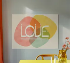 Notre design combine le message intemporel de l'amour avec une esthétique moderne et géométrique. Les lettres "L", "O", "V" et "E" sont artistiquement intégrées dans des formes claires et précises.