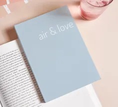 Lettrage « air & love » en blanc sur fond bleu clair. Optimisme et légèreté.