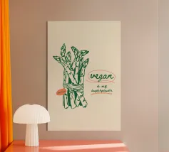 Une charmante illustration d'une botte d'asperges fraîches, nouée simplement et dessinée dans des tons doux et terreux. Parfait pour les cuisines, les salles à manger ou les espaces de style maison de ferme - mêlant chaleur rustique et design épuré et moderne.
