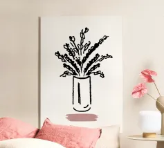Des branches délicates avec de petites fleurs sont disposées dans un simple pot en verre. L'arrière-plan présente un motif en grille qui ajoute un contraste structuré aux formes organiques des fleurs.