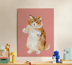 Portrait stylisé d'un chat calicot avec des taches vertes et orange distinctes sur sa fourrure blanche. Le chat a une expression douce et se détache sur un fond rouge audacieux, mettant en valeur son pelage unique.