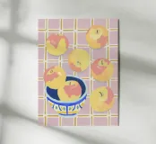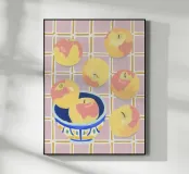 Cette illustration minimaliste montre une coupe de fruits bleus remplie de pommes saines sur une nappe élégante avec un motif à carreaux. Les couleurs douces de rose lilas, d'orange et de beige ajoutent une touche de fraîcheur à l'œuvre d'art. Parfait pour la cuisine, ce graphisme de fruits promeut une alimentation saine et allie esthétique et plaisir.