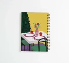 Scène d'intérieur simple et moderne d'une table dressée pour deux personnes, avec un vase de fleurs en guise de centre de table. Le mur jaune et le décor minimaliste créent une atmosphère d'intimité tranquille et de simplicité chic.