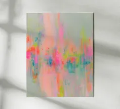 Dieses abstrakte Kunstwerk zeigt ineinanderfließende Farbflächen in Pastellrosa, Gelb, Blau und Grün und Pink. Die weichen Pinselstrukturen und die harmonische Popart Farbkomposition erzeugen eine Vibrierende, Lebendige Atmosphäre. Das Motiv wirkt modern, leicht und emotional und lädt zur freien Interpretation ein.