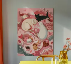 Cette peinture montre deux chats dans une pièce confortable en train de prendre un repas de fête. L'un d'eux, enveloppé dans une couverture rouge, contemple une assiette de crêpes, tandis que des décorations joyeuses et des ornements suspendus animent la scène.