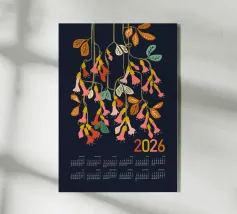 Un motif botanique ludique avec des fleurs pendantes en forme de clochettes dans des tons roses, corail et rouges. Les vrilles sinueuses ressemblent à un rideau naturel, parsemé de feuilles stylisées d'un orange chaud et d'un vert frais. Sur un fond bleu foncé, il en résulte un look moderne et légèrement folklorique.