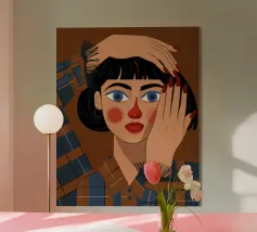 Ce tableau représente une personne aux cheveux roses tenant un petit objet, sur un fond rose. Les couleurs chaudes et la pose contemplative évoquent un sentiment d'introspection et de calme.