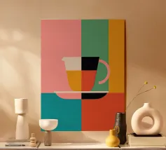 Une nature morte minimaliste qui capture un moment de chaleur et d'attention. Des coups de pinceau doux et des teintes superposées de pêche, de corail et de vert tendre entourent une simple tasse rayée, évoquant le calme, la présence et la tendresse. Cette œuvre d'art reflète une pause dans le temps - un petit rituel réconfortant réalisé avec intention. Idéal pour les intérieurs modernes, scandinaves ou contemporains.