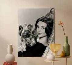 Candide et joyeuse, Billie Holiday tient un petit chien, révélant sa chaleureuse humanité en dehors de la scène. billie holiday, souriante, animal de compagnie, photo vintage, moment hors scène, chanteuse de jazz, fleur dans les cheveux, aquarelle candide, joie rétro, femme pleine d'âme, enjouée, icône du jazz, style classique, grâce féminine, moment vintage, tons doux, journée de dame détendue, charme des années 1940, chaleur émotionnelle, personnage historique