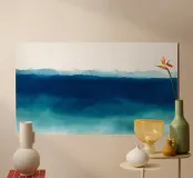 Étude de simplicité et de tonalité, ce paysage marin minimaliste invite à la réflexion. Des couches de bleu marine profond, de bleu océan et d'aqua brumeux créent un dégradé apaisant qui convient parfaitement aux intérieurs modernes, aux espaces inspirés des spas ou à toute pièce ayant besoin d'un point d'ancrage paisible.