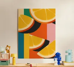 A graphic, pop art style pattern of orange slices against a dark blue background. The composition is modern, vibrant, and a fresh, zesty, and stylish design.