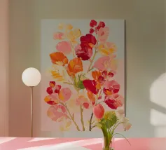 Une expression florale abstraite où des pétales translucides s'épanouissent en couches superposées de rouge, d'ocre et de blush sur un fond de sauge sourde. La composition embrasse l'asymétrie et la tension, chaque forme organique faisant écho à l'imperfection naturelle. Délicat mais audacieux, le rythme visuel évoque un sentiment d'expansion tranquille, comme un murmure botanique suspendu dans le temps.