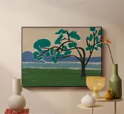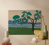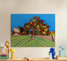 Un arbre solitaire aux larges feuilles vertes se dresse au premier plan sur un fond aux nuances de bleu, suggérant des collines ou des montagnes lointaines. Le champ est d'un vert éclatant, avec des coups de pinceau visibles partout, et le ciel a une teinte beige, ce qui donne à la scène une qualité simpliste, presque enfantine.