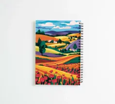 Un magnifique paysage pictural de champs vallonnés, probablement de lavande ou de vignobles, sous un vaste ciel. Les couleurs vives et les lignes larges donnent une impression d'espace ouvert, de liberté et de beauté de la campagne.