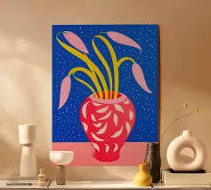 A bold red vase, filled with various flowers, sits on a blue patterned surface, with a dynamic pink and patterned background creating a richly textured and colorful composition.