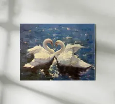 Cette peinture à l'huile ne représente pas simplement un cygne, mais capture plutôt un sentiment d'élégance et de pureté. Le cygne glisse gracieusement sur le lac immobile, telle une princesse de conte de fées. Les teintes dorées de l'aube baignent la surface de l'eau, créant une atmosphère romantique et poétique. La peinture évoque un sentiment de sérénité, de douceur et d'onirisme face à la beauté de la nature. Les plumes blanches de l'oiseau contrastent magnifiquement avec le bleu du lac, composant une symphonie harmonieuse de couleurs et d'émotions.