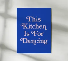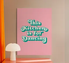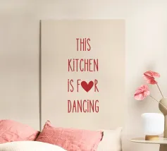 This kitchen is for dancing dans une belle bordure ondulée, sur du rose avec du rouge.