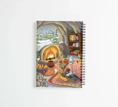 Une pièce confortable avec une cheminée, une table garnie de thé et d'en-cas, et une vue sur un paysage enneigé à l'extérieur. La scène respire la chaleur et la tranquillité, ce qui est parfait pour une retraite hivernale.