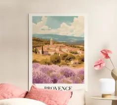 Affiche de décoration illustrant un paysage provençal du Vaucluse, avec des champs de lavande en fleurs, une maison en pierre traditionnelle et des cyprès. Une scène paisible et colorée, parfaite pour apporter une touche de sérénité et de charme méditerranéen à votre intérieur.