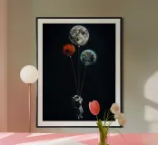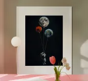 Un astronaute flotte dans l'obscurité de l'espace en se tenant à des cordes attachées à trois ballons en forme de planète. Les ballons représentent la Lune, Mars et la Terre. L'astronaute porte une combinaison spatiale blanche et un sac à dos. L'arrière-plan est d'un noir profond, parsemé de nombreuses étoiles. L'image évoque un sentiment d'émerveillement et d'exploration.