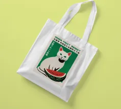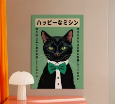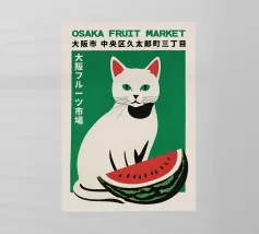chat melon d'eau fruit marché Osaka texte japonais fond vert affiche conception graphique publicité tranche de pastèque chat blanc marques noires texte en japonais graines de pastèque rouges écorce verte vintage animaux chats signalisation