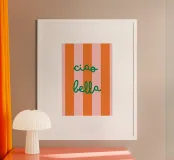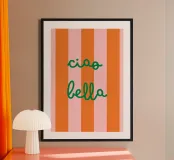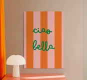 Dites Ciao Bella ! avec style et élégance ! Cet imprimé joyeux présente la salutation italienne classique en typographie audacieuse et ludique sur fond de rayures orange et roses vibrantes. Mélange parfait de chaleur et d'amusement, ce motif ajoute une touche énergique et accueillante à n'importe quelle pièce. Que vous souhaitiez décorer votre cuisine, votre salon ou offrir à un ami, cet imprimé coloré apportera à coup sûr des ondes positives et une touche de charme sans effort à votre espace.