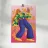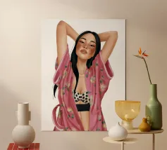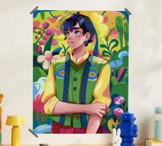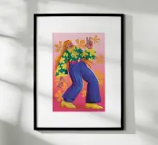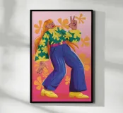 Cette œuvre d'art représente une personne vêtue d'un haut à fleurs jaune vif et d'un pantalon bleu, prenant une pose dynamique sur un fond rose à motifs floraux orange.