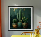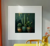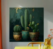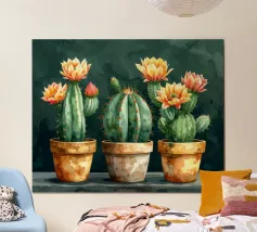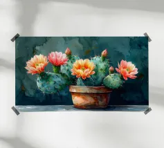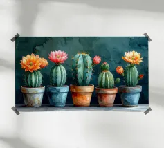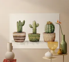« Force silencieuse » Entre épines et formes douces naît un moment paisible plein de caractère. Les cactus symbolisent la patience, la résistance et la beauté qui naît du calme. Des couleurs vives et de fines structures aquarellées allient robustesse et douceur – un design qui donne du courage, rayonne d'équilibre et apporte une élégance naturelle à la pièce.