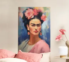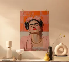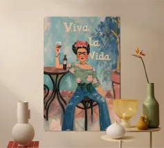 Le motif représente une illustration inspirée de Frida, montrant une femme sûre d'elle dans une scène de café détendue, avec une coiffure relevée caractéristique, des accents floraux et un regard expressif. La palette de couleurs chaudes, les lignes esquissées et la peinture moderne allient force artistique et intimité sereine. Dans l'ensemble, l'image est créative, féminine et intemporelle, idéale comme décoration murale élégante et expressive.